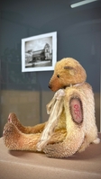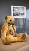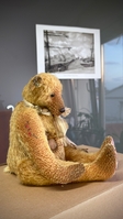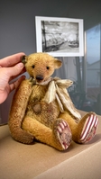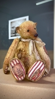 Зшитий з двох красивих кольорів мохеру. Має скляні очі.Комбіноване складне наповнення з натуральних матеріалів надає ведмедику особливого затишку й м’якості, а подвійне шплінтове кріплення голови і верхніх лап додає йому дуже цікавої, "живої" рухливості.На тілі ведмедика багато декоративної вишивки і елементів зістарювання. Складний і цікавий в роботі, дуже незвичний колекційний ведмедик.